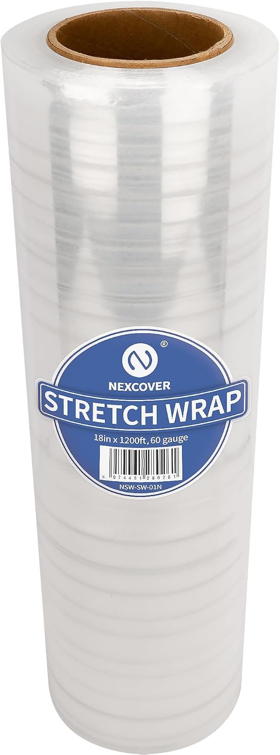 NEXCOVER 18 Inch Stretch Wrap – 1200 Feet | 60 Gauge, 1 Roll Clear Plastic Self-adhering Stretch Wrap Film for Pallet Wrap, Thick and Sturdy Packing Moving Supplies Heavy Duty Shrink Film.
