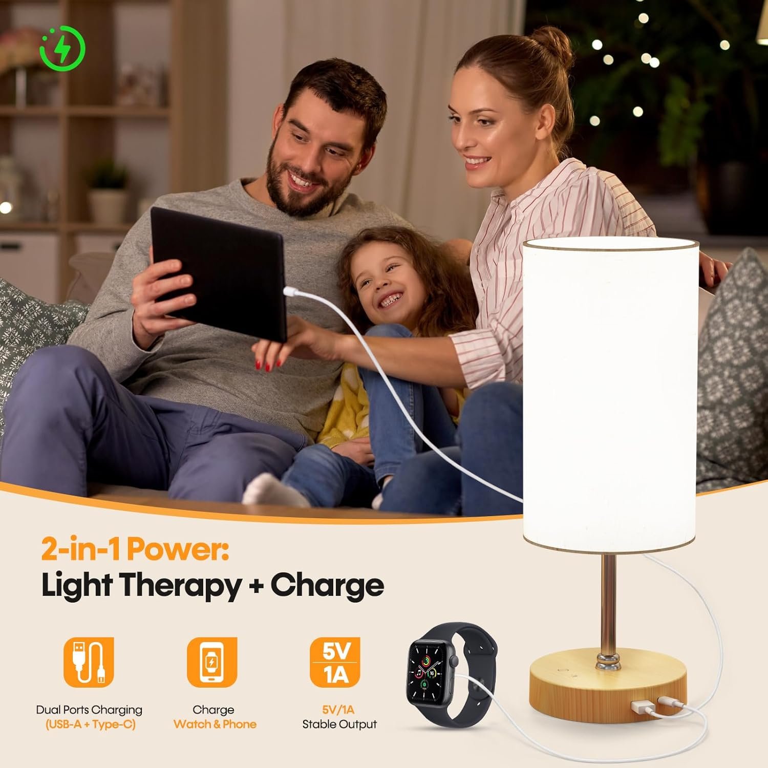 【Remote Control & Dual USB Charging Hub】Enjoy ultimate convenience. The included remote lets you easily adjust settings from across the room and set automatic timers for 30, 60, or 90 minutes. The built-in USB-A and USB-C ports keep your phone and other devices powered, whether the sunlight is on or off, making it a versatile centerpiece for your desk or bedside.