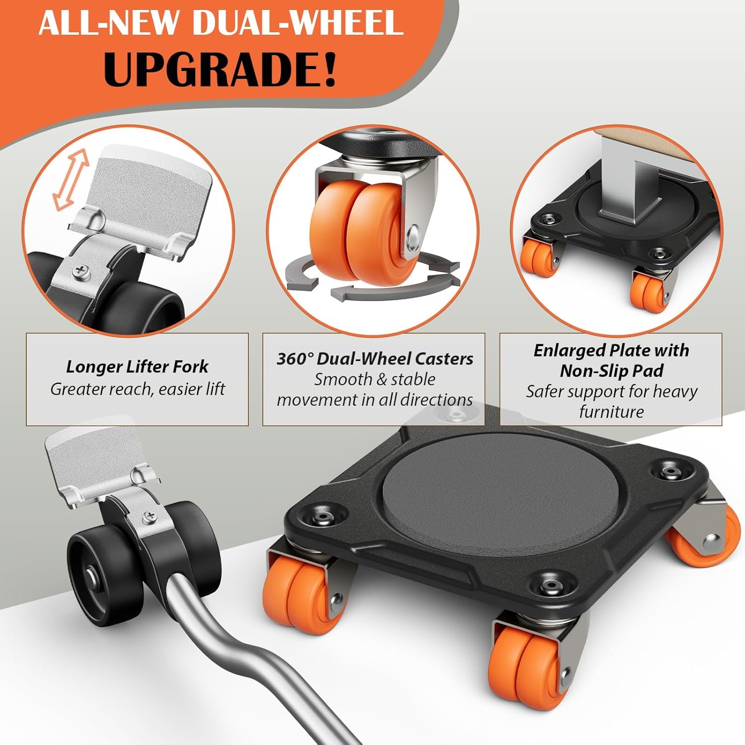 COMPLETE DOLLY KIT – Package includes 4 double-wheeled dollies, 1 auxiliary lifter, crowbar base, and anti-slip pads. A professional dolly kit heavy duty furniture mover set designed for home, office, or warehouse use