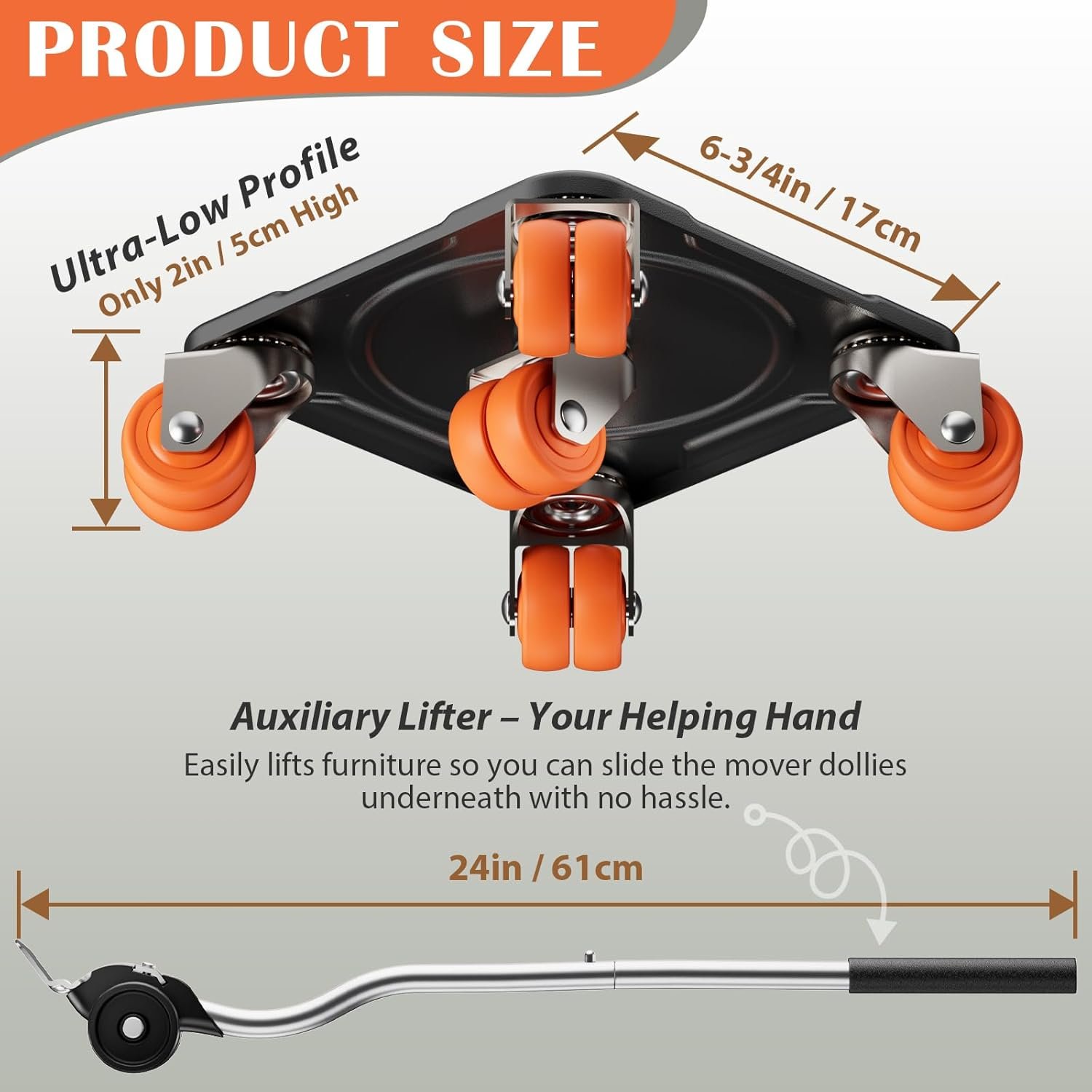 LOW-PROFILE & EASY SETUP – At just 2 inches high, the dolly slides easily under furniture and appliances. Combined with the included furniture lifter tool, you can raise and position heavy items with minimal effort