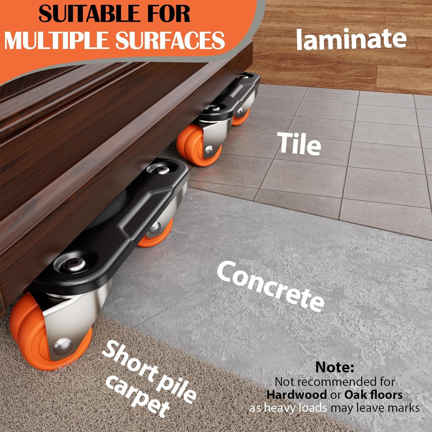 VERSATILE ON MULTIPLE GROUND – Heavy duty furniture movers with PA double wheels roll smoothly on carpet, tile, epoxy, and concrete. For hardwood floors, use with care to avoid possible wheel marks when moving heavy loads