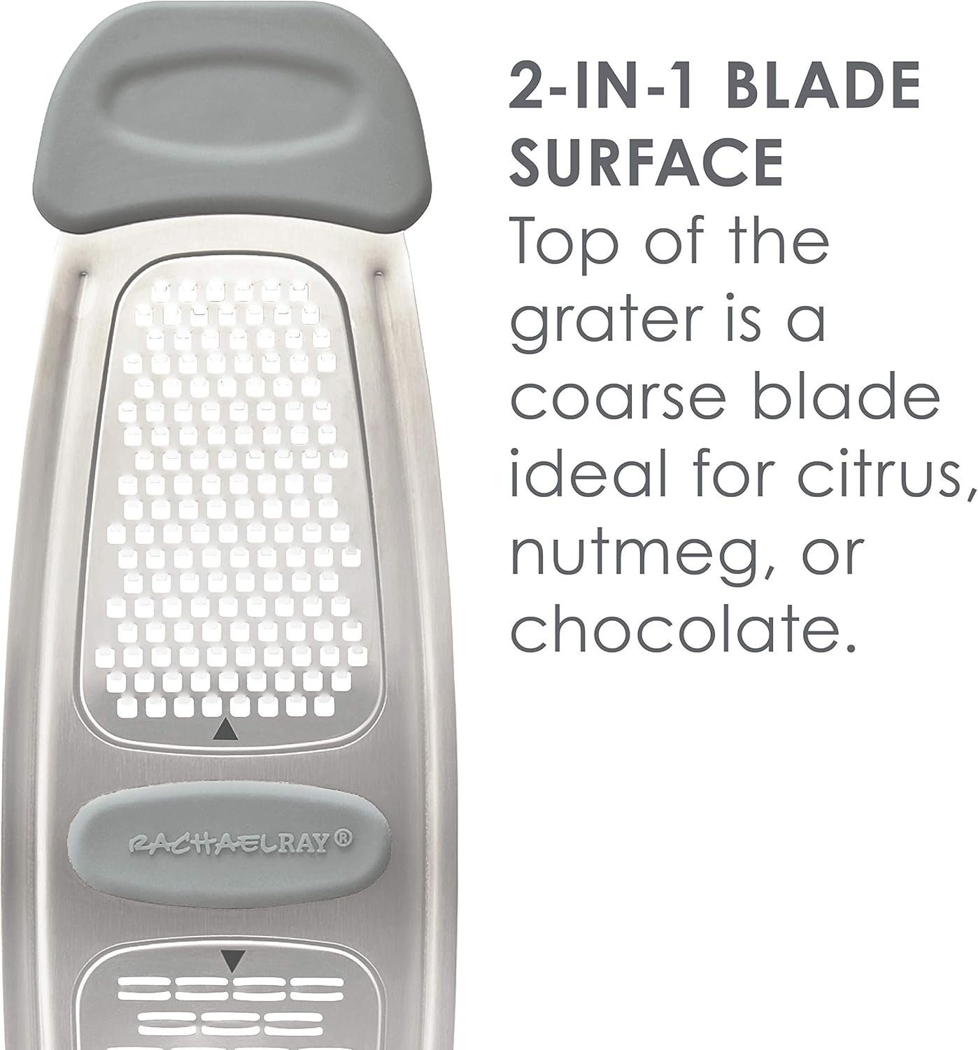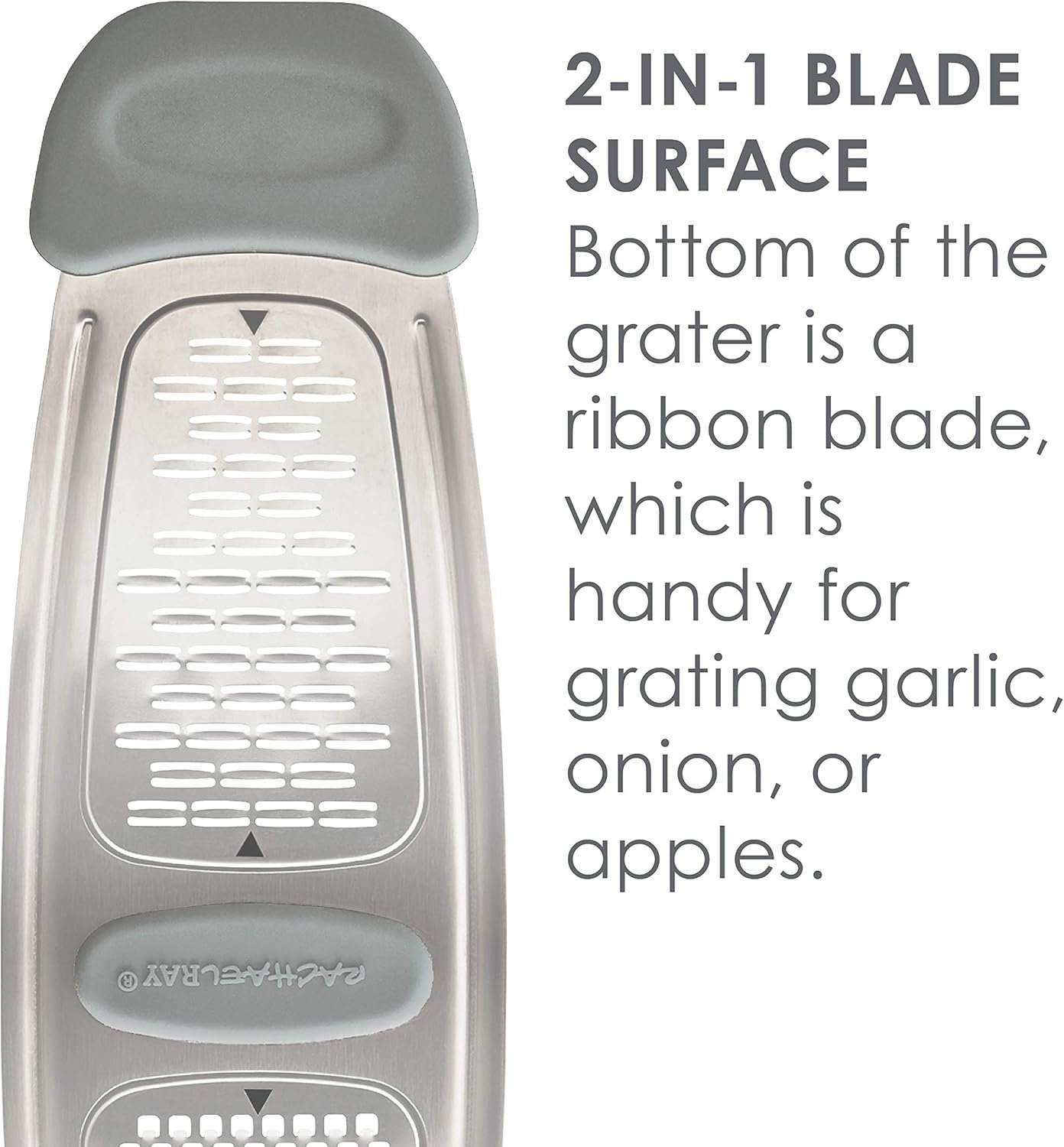 Grate and zest you way to delicious meals with the Rachael Ray Stainless Steel and Silicone multi-grater. This cheese grater and citrus zester is made from durable stainless steel for long-lasting grating performance and features a curved shape to fit over pots and pans, plates and platters, as well as cutting boards and prep mats. Grater features multiple grating options for fine grating and zesting and is top-rack dishwasher safe for easy cleaning.