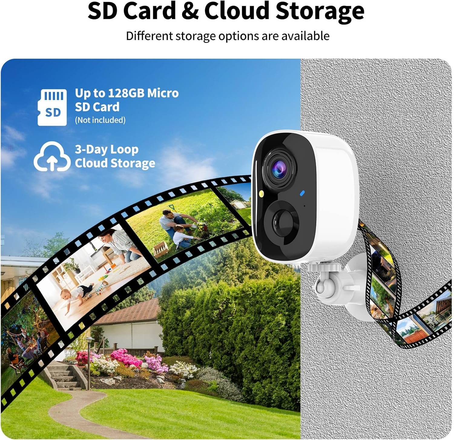3-Day Cloud Storage & Expandable Options: Securely store footage with 3-day rolling cloud backups. For extended coverage, upgrade to premium cloud plans (subscription required) or use a microSD card for local storage(up to 128GB, not included)