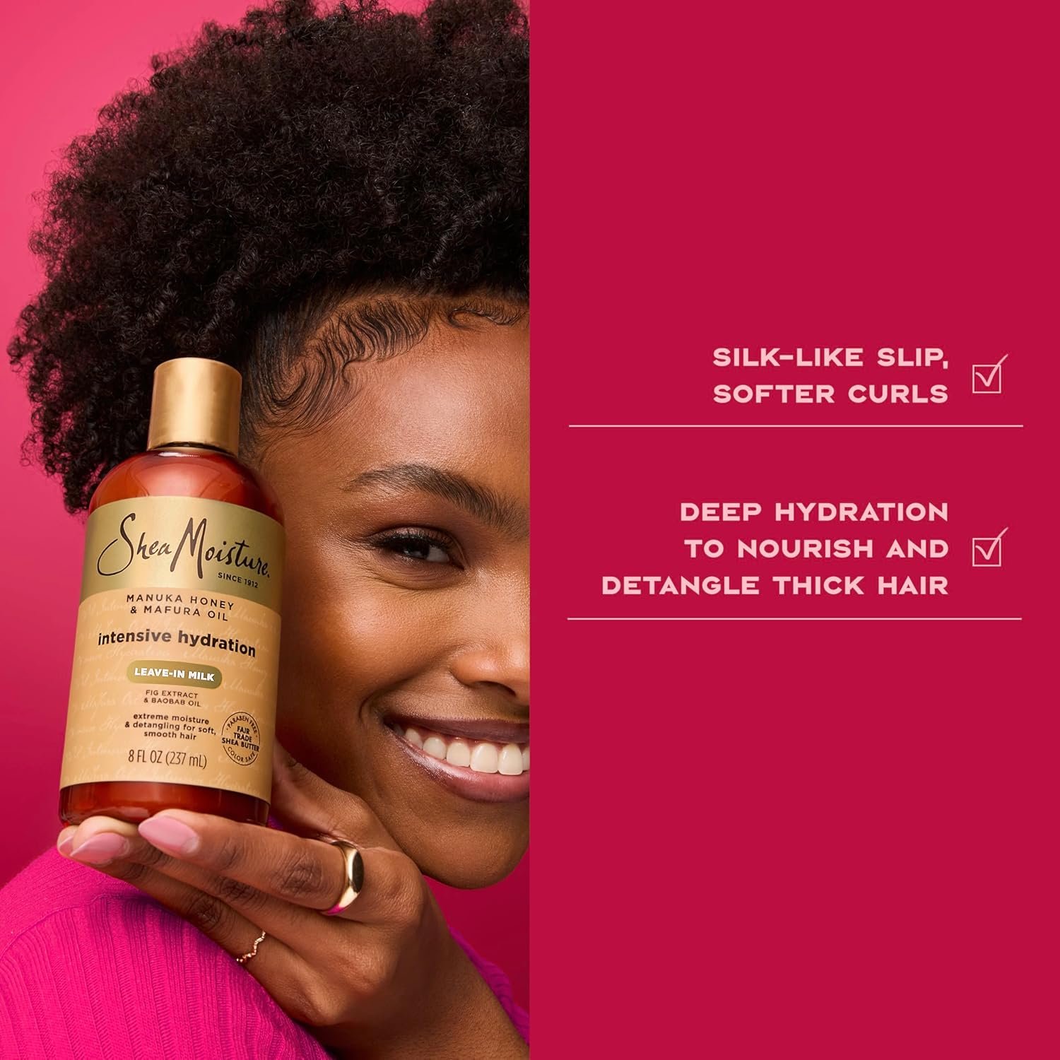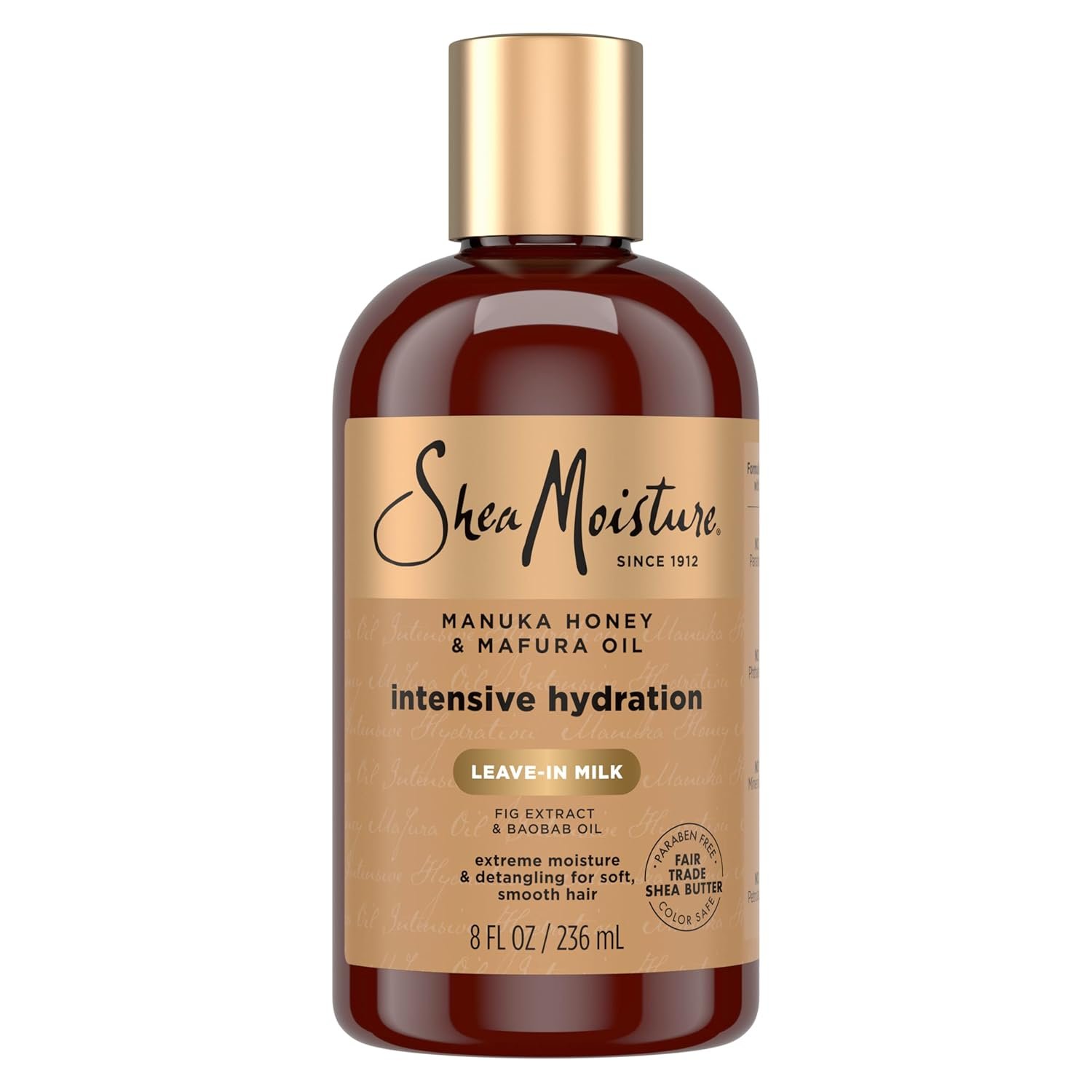 Deeply moisturize hair that is thirsting for more moisture with SheaMoisture Manuka Honey & Mafura Oil Intensive Hydration Leave-In Milk. SheaMoisture Manuka Honey & Mafura Oil Intensive Hydration Leave-In Milk deeply moisturizes, effortlessly detangles dry hair, and improves manageability for easy, natural styling. Blended with Shea Butter, Honey, Mafura and Baobab Oils and African Rock Fig, this milk helps hair regain softness, body and shine. This leave-in milk blended with Manuka Honey, helps to soothe the scalp, and create a moisturizing mask for dry hair. This is our best milk for dry, brittle hair. Ever-versatile, it’s perfect for natural and transitioning hair types. SheaMoisture is known and loved for its sustainably produced goodness. Our hair products are formulated with no parabens, no phthalates, no mineral oil and no sulfates. Tested on our family for four generations, and never on animals. SheaMoisture is the legacy of Sofi Tucker, a pioneering mother of four and an entrepreneur, who sold Shea Butter, African Black Soap and homemade beauty preparations in Sierra Leone in 1912. We honor her vision by continuing to formulate with Raw Shea Butter handcrafted by women in Africa. With every purchase you show support of our mission to reinvest back in our communities.