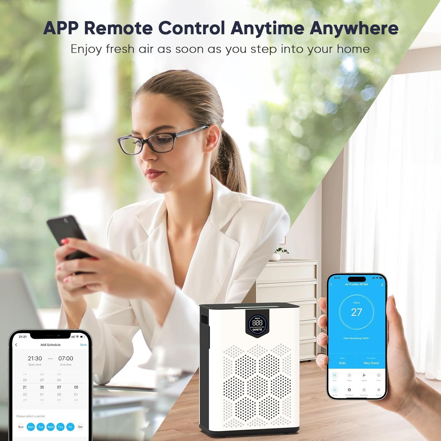【𝐒𝐦𝐚𝐫𝐭 𝐂𝐨𝐧𝐭𝐫𝐨𝐥 𝐟𝐨𝐫 𝐀𝐧𝐲𝐭𝐢𝐦𝐞, 𝐀𝐧𝐲𝐰𝐡𝐞𝐫𝐞】Remotely master your air purifier via our Smart Home Life app, compatible with 2.4GHz Wi-Fi, for control unhindered by time or distance. Monitor your indoor air quality in real-time, turning off/on, changing modes or fan speed, creating a schedule, using a timer, track filter usage, and reorder replacements filter. Start it when you get off work and enjoy fresh air as soon as you get home