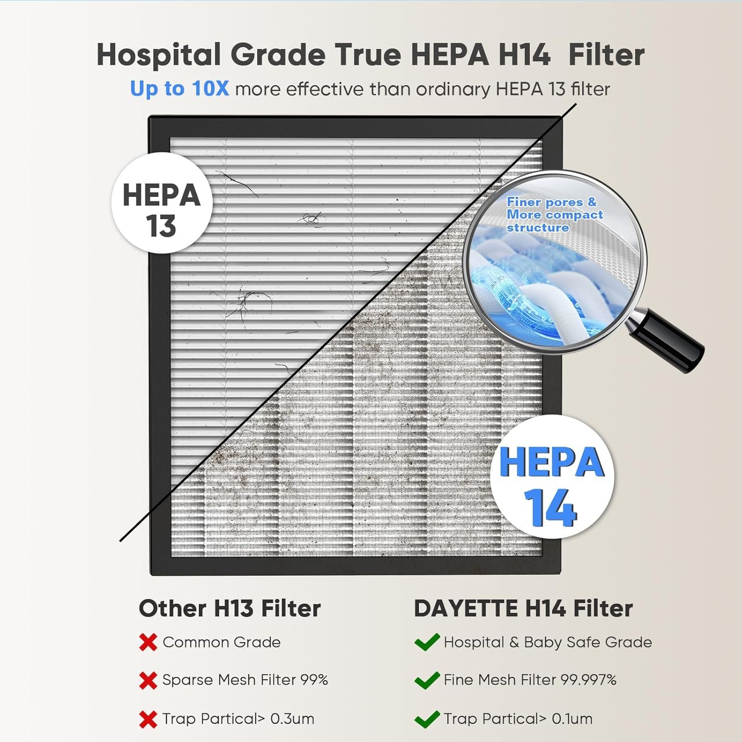 【𝐏𝐨𝐰𝐞𝐫𝐟𝐮𝐥 𝐇𝟏𝟒 𝐇𝐄𝐏𝐀 𝐅𝐢𝐥𝐭𝐞𝐫】Our New Air Purifiers upgraded to the H14 HEPA filter, which can capture 99.997% of particles as small as 0.1 micron, more efficient and powerful than H13, combined with pre-filter, H14 HEPA filter, activated carbon filter and net filter to achieve the highest performance, such as dust, smoke, pollen, hair and odor. You can enjoy a fresher, cleaner air environment and breathe easier