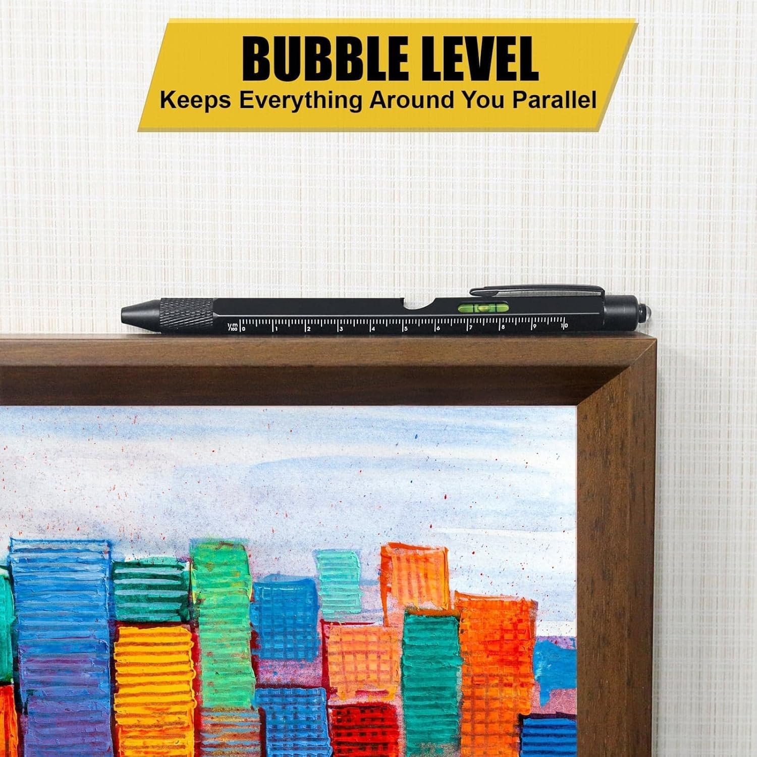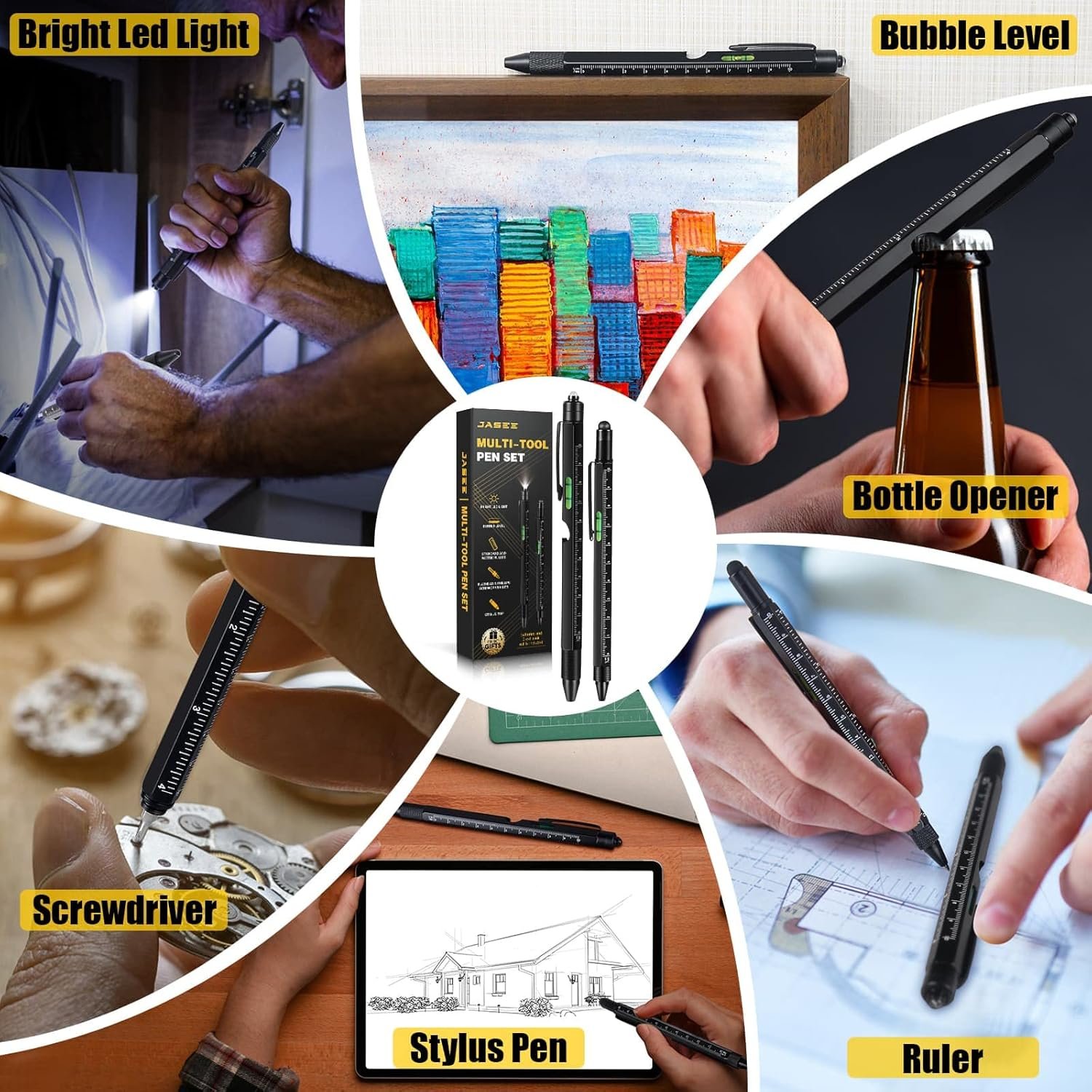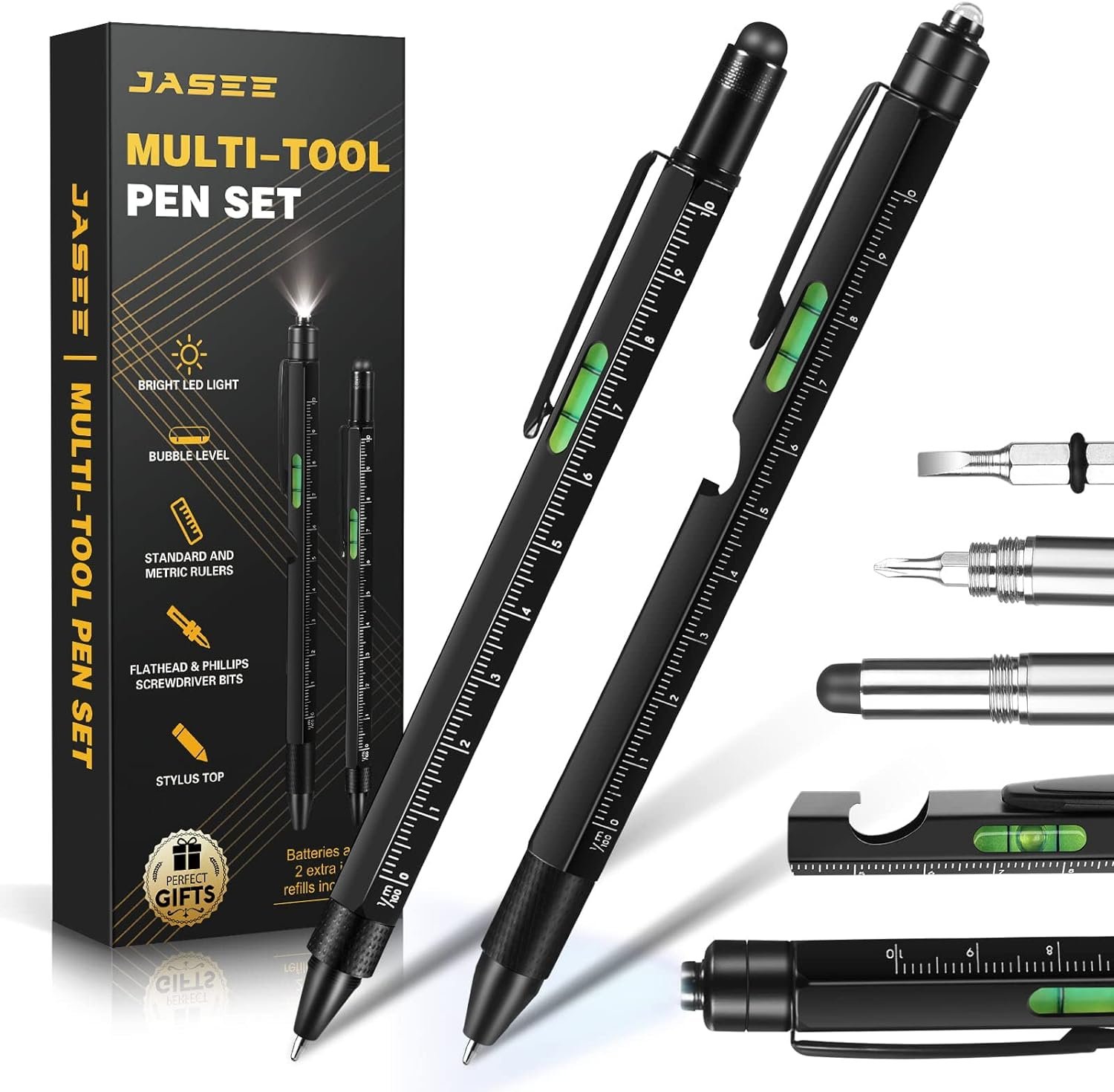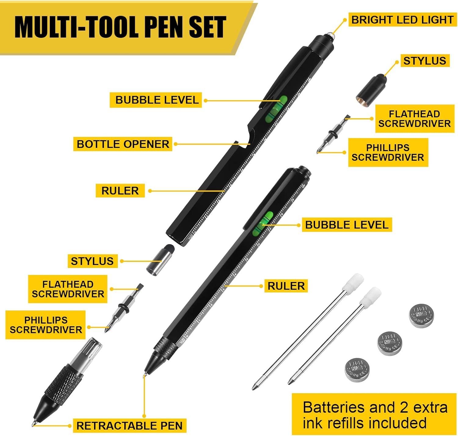 9 IN 1 MULTI-TOOL PEN: Multi-Functional Pen Set has 9 handy functions, led light, stylus top, retractable ballpoint pen, bubble leveler, bottle opener, Centimeters, Inches rulers, Flat and Phillips screwdriver