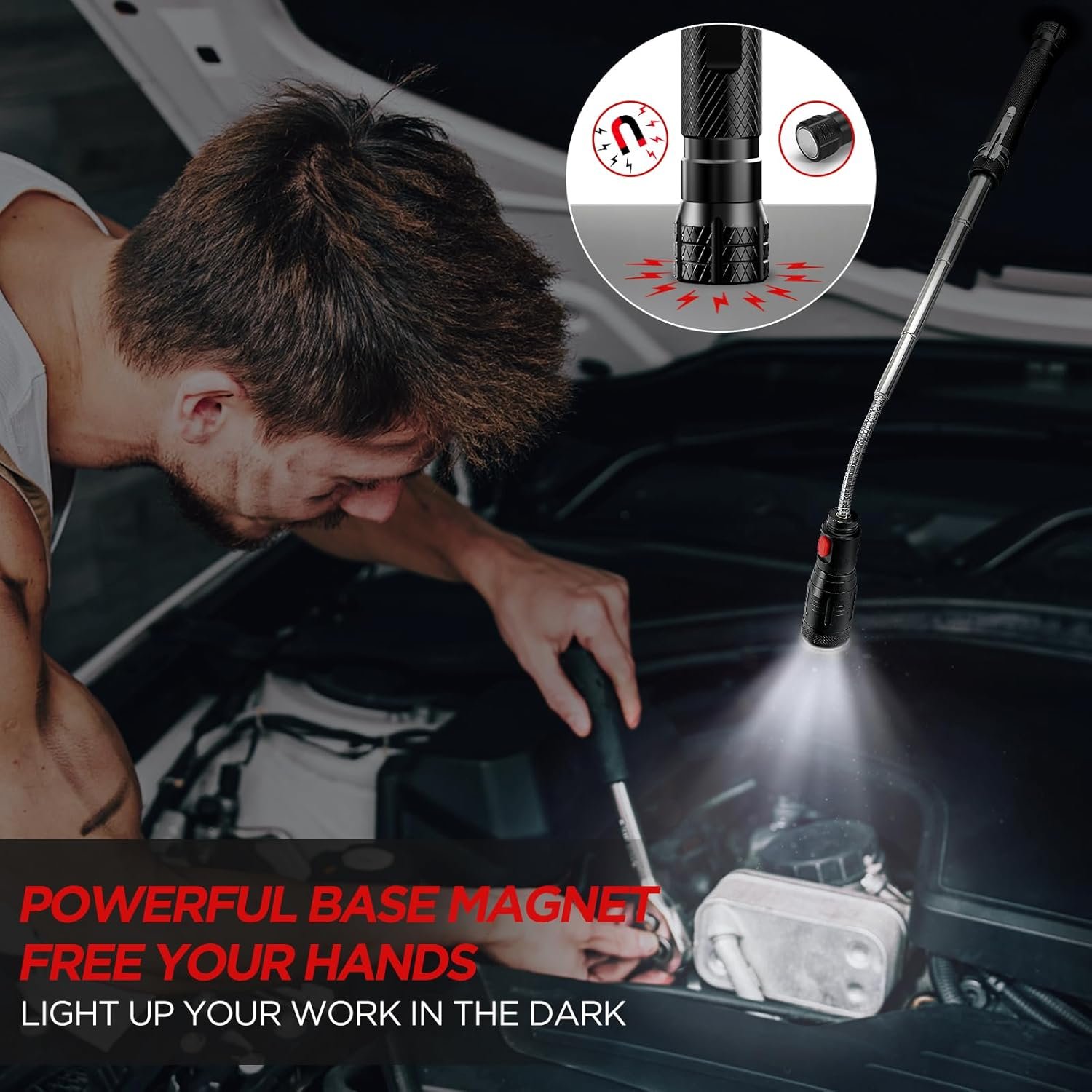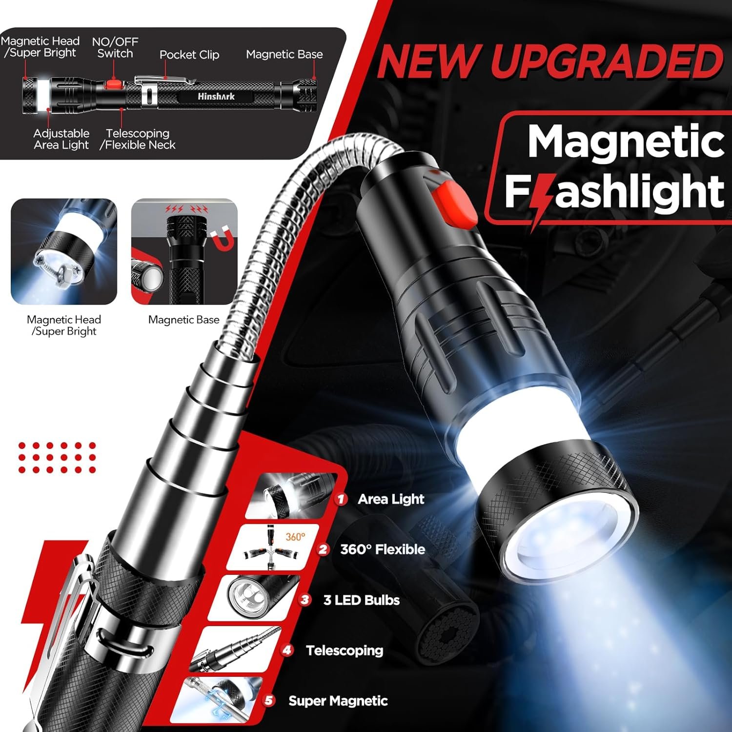 【Expandable & Flexible】The flexible telescoping magnetic flashlight extends from 6.8″ to 23″. 360° soft neck adjusts height and angle. There are pocket clips and non-slip surface designs for easy carrying and a firm grasp