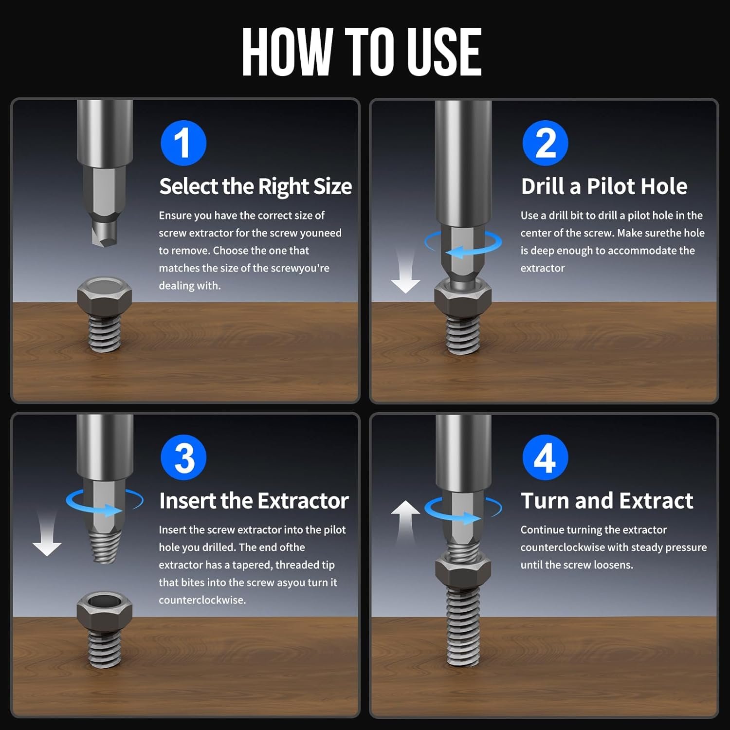 Easy to Use: Choose a bit slightly smaller than the damaged screw to drill a reverse hole, then switch to the extractor bit, apply steady downward pressure, and turn counterclockwise at low speed to allow the bit to grip the screw for easy removal