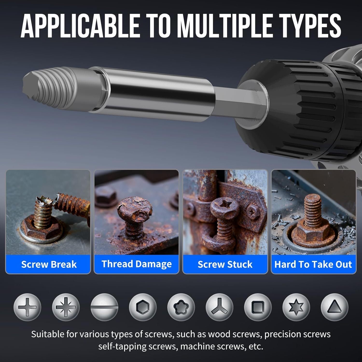 Compatible with Standard Drills: Includes 20 stripped screw extractors (Ex#1~#10, Dr#1~#10), 10 screwdriver bits, an extension shaft, and a socket adapter. It works with 3-12 mm screws and bolts, making it perfect for removing damaged, broken, or rusted screws and bolts
