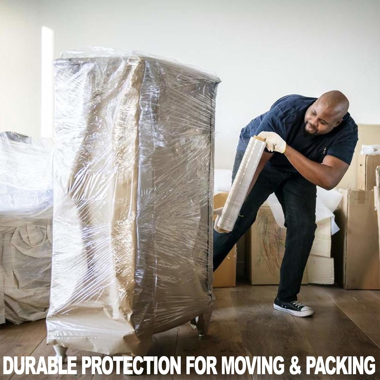 A high-performance packaging material with 500% stretch capacity, this wrap film is made from industrial-grade material at 60 gauge (20 micron) thickness to ensure superior durability and tear resistance to securely wrap and seal items without the need for additional tape. Each roll measures 15 inches wide x 1,000 feet long and features a smooth surface that resists dust and dirt, ensuring items are clean and removed without residue, protecting items intact. Package includes 4 rolls of stretch film and 2 handles, easy and quick to operate, just insert the handles into the ends of the rolls to start packing, efficient and labor-saving, suitable for personal or professional use. Its versatility makes it widely used in a variety of scenarios such as logistics and transportation, pallet packing, home moving, office packing, furniture protection and luggage covering, providing all-weather protection for items. We are committed to providing quality products and customer service to ensure that goods are protected from rain, snow and dust during transportation. If you have any questions, feel free to contact customer service for assistance, providing you with a worry-free shopping experience.
