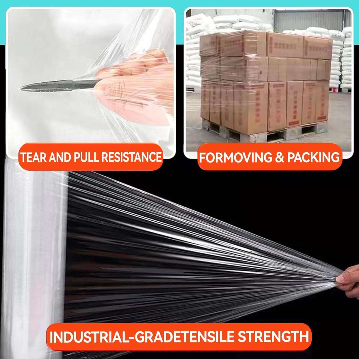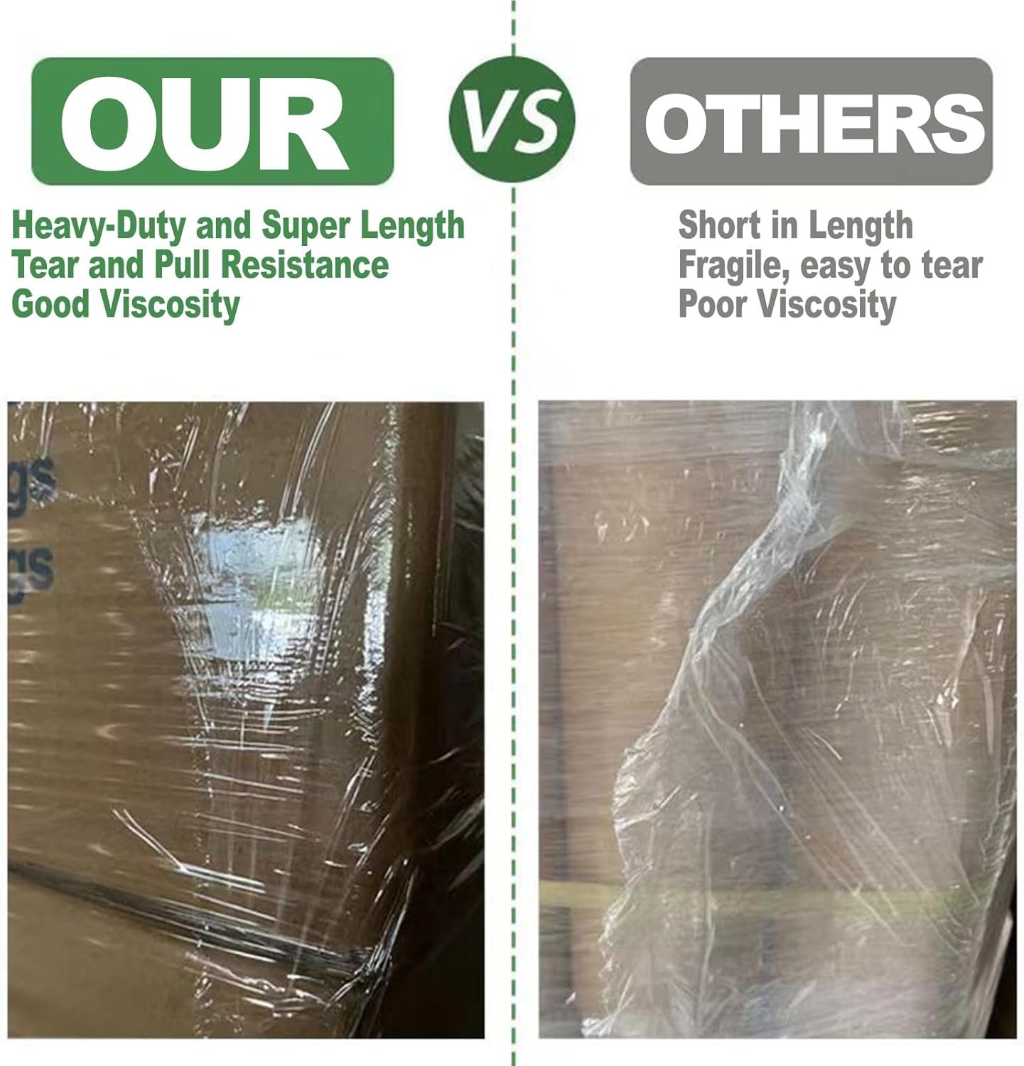【Industrial Strength】Up to 500% tensile capacity, made of 60 gauge thickness material for industrial strength and durability. This makes it easy to wrap and seal items securely without the need for additional tape.