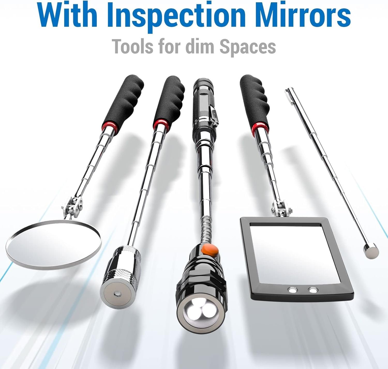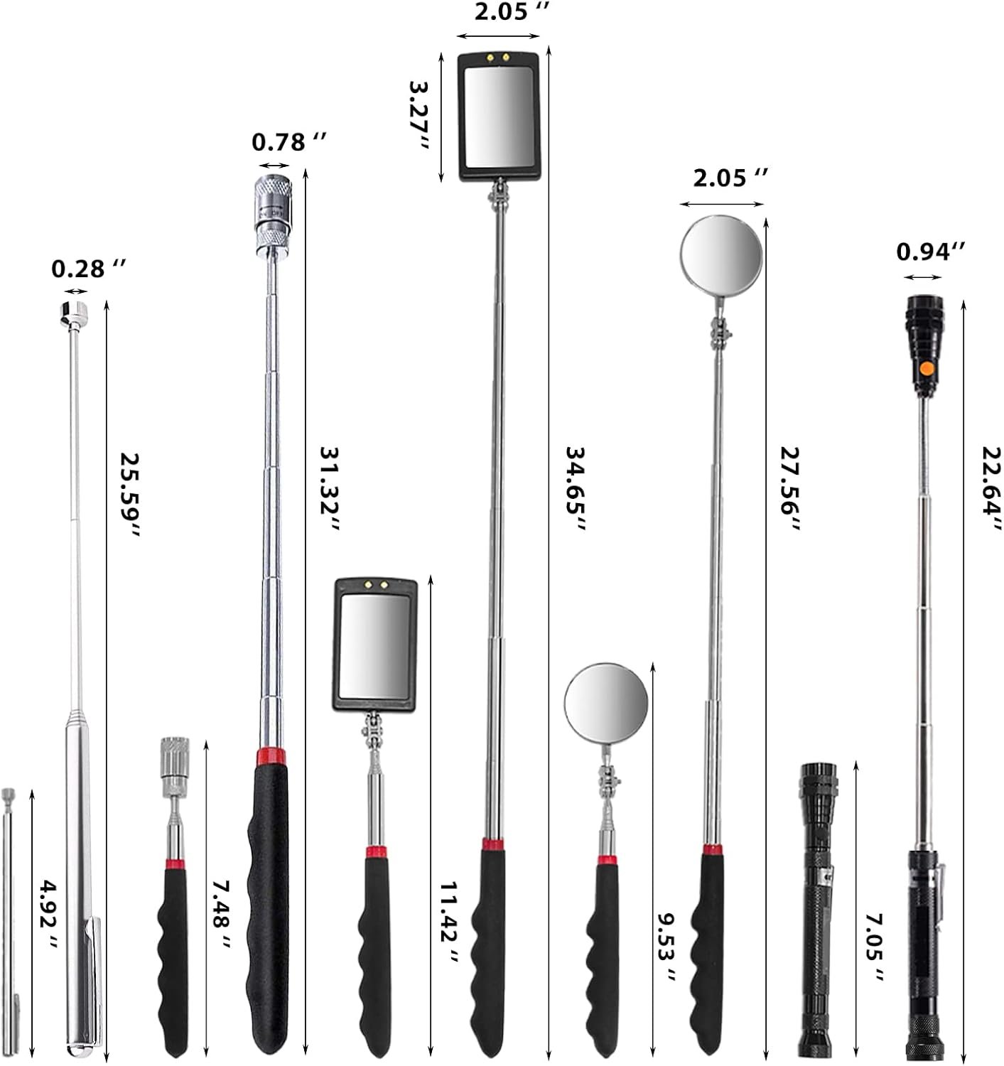 Tools includes: 1 piece 1lb magnetic pickup rod, 1 piece 15lb magnetic pickup tool with LED light, 1 round shaped inspection mirror, 1 square shaped inspection mirror with LED light and 1 telescoping magnetic pickup stick with flashlight