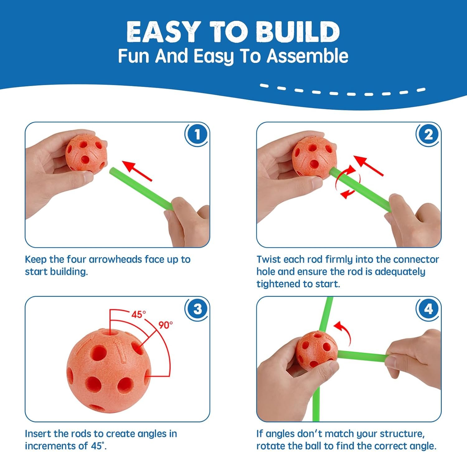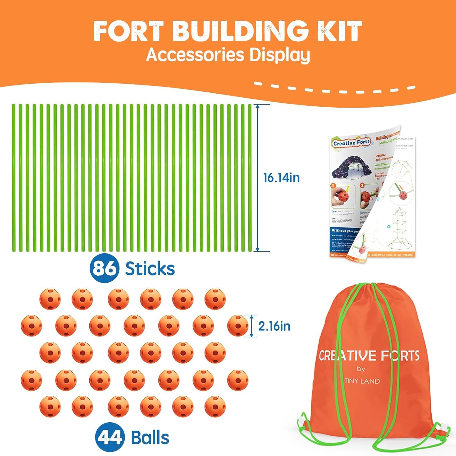 Fort Building Kit: 130 Piece Building Kit – 44 balls and 86 rods. Easy to assemble and won’t fall apart. Kids can assemble and disassemble it at will, creating a multitude of possible building structures. It comes with a pouch for storage and carrying.