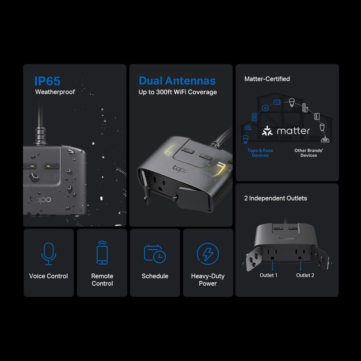 The Tapo P400M is a Matter-Certified Smart WiFi Outdoor Plug that integrates seamlessly with certified smart home platforms like Apple Home, Alexa, Google Home, and Samsung SmartThings. It has 2 individually controlled outlets for managing multiple devices via voice or app, with separate scheduling. Designed for outdoor durability, this smart plug boasts an IP65 rating for weather resistance. Its dual-antenna configuration guarantees a stable and reliable signal transmission.