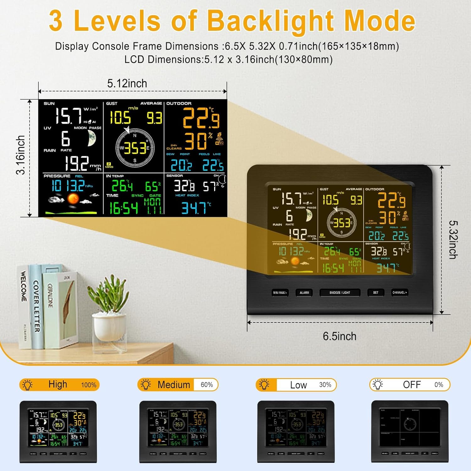 3 Adjustable Back Light and Practical Alarm Functions: The wireless wifi weather station has a color display and 3 levels of brightness adjustment for easy reading. With a built-in stand and hanging hole, it can be placed anywhere. It also features alarms function, including time alarm, indoor and outdoor temperature & humidity, gust/average wind speed, barometric pressure, rainfall, light and more. Ideal for decorating home, living rooms, kitchens