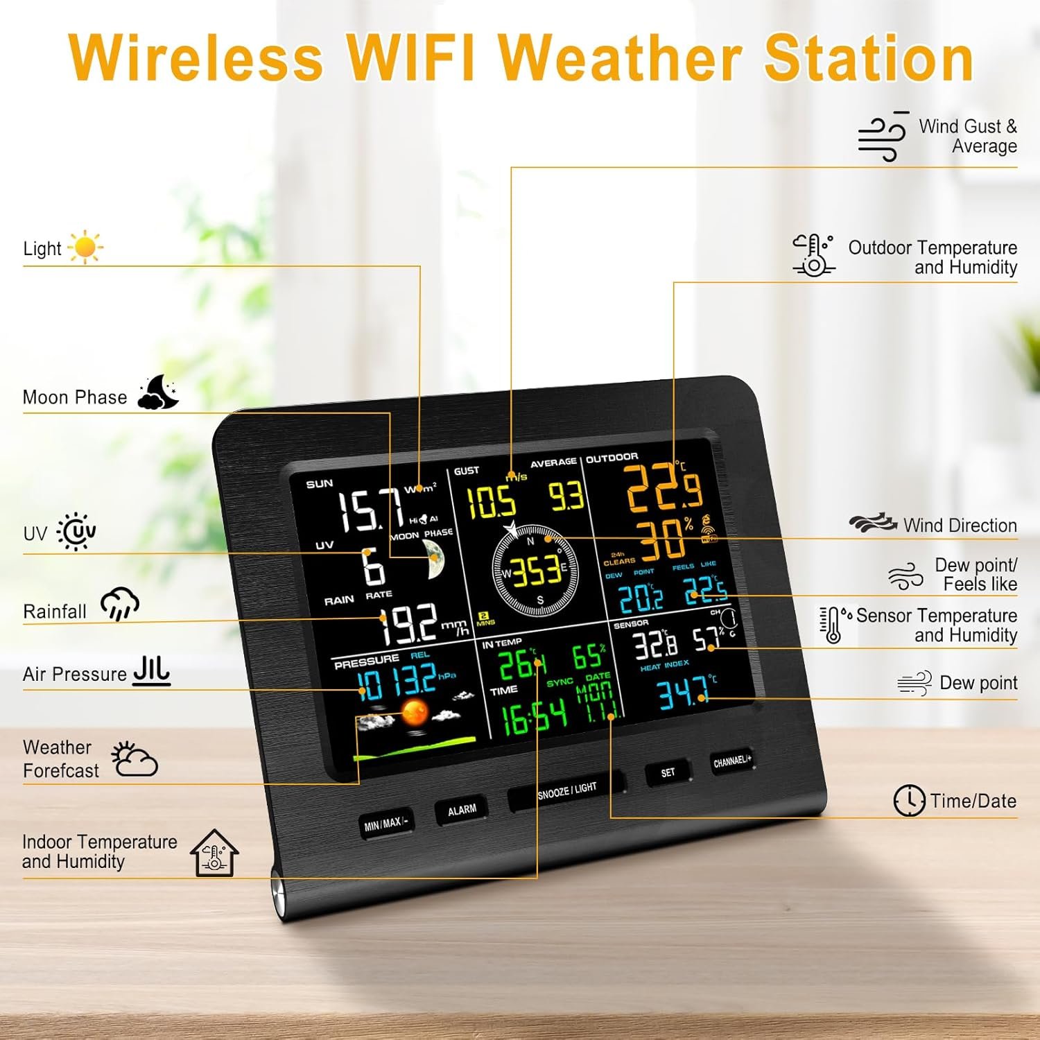 7-in-1 Professional Weather Station: Our weather station provides real-time weather data based on your own environmental conditions, including indoor/outdoor temperature and humidity, wind speed/direction, weather forecast, barometric pressure, rainfall (1 hour, 24 hours, week, month and total rainfall), uv, light, moon phase, date, and alarm clock, rain and other environmental readings. Supports manual calibration of temperature, humidity, wind speed, barometric pressure, and rainfall