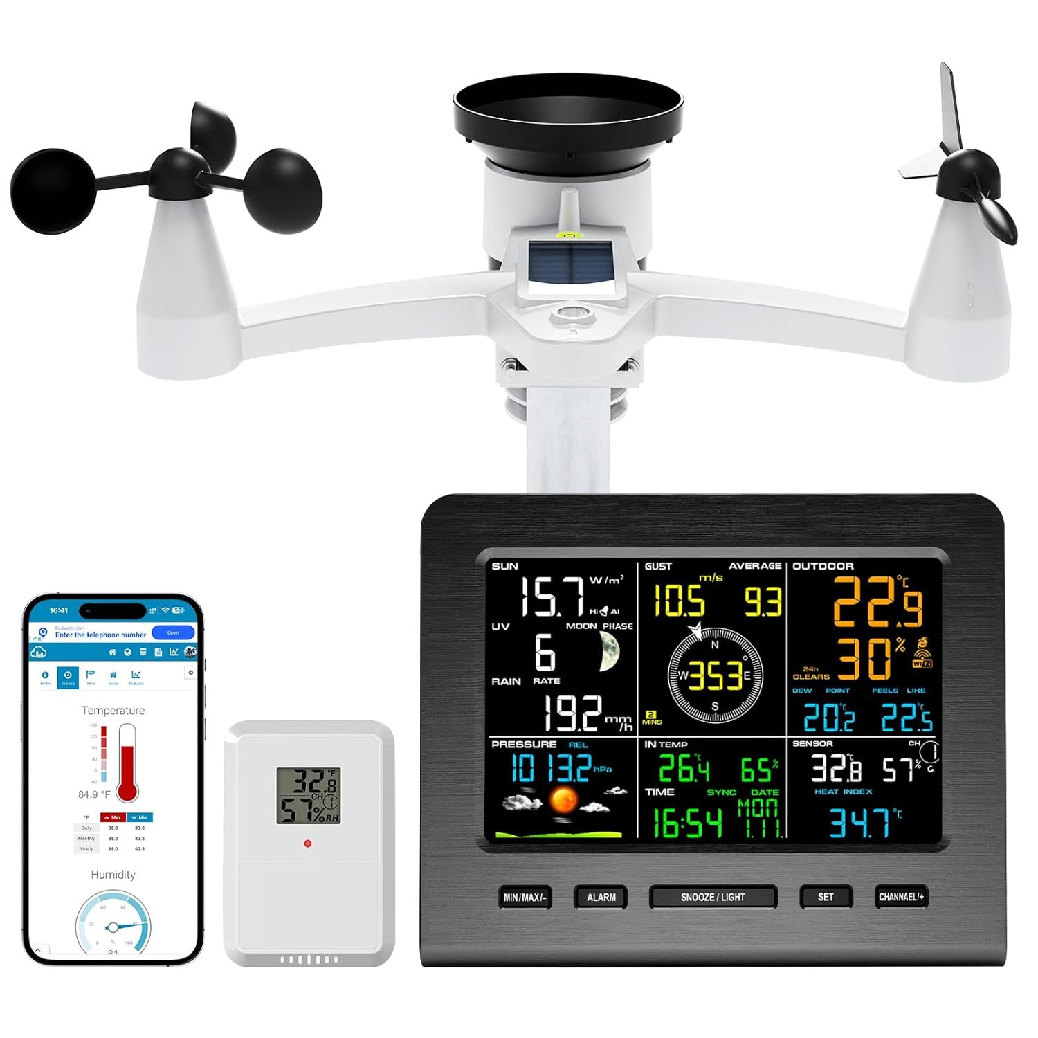 Integrated Outdoor Sensor: The outdoor sensor consists of a wind vane, an anemometer, temperature and humidity sensors, solar panel and a rain collector. and the sensor array requires 3 AAA batteries (not included). Provides real-time local weather updates through an indoor display console and an integrated outdoor array sensor