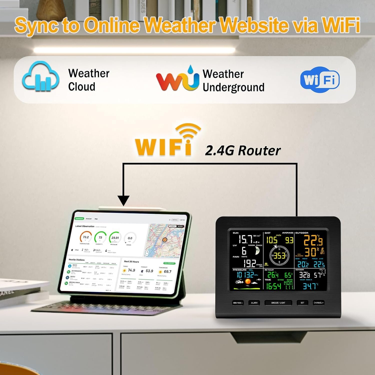 Wi-Fi SYNC and Live Weather Servers: The home weather station indoor console features enhanced built-in Wi-Fi with 2.4G router support and data upload to weather underground, pwsweather, and weathercloud on your PC or smart device, giving you access to current data to view, analyze, share, and compare information from your local personal weather station. share and compare data from your local personal weather station