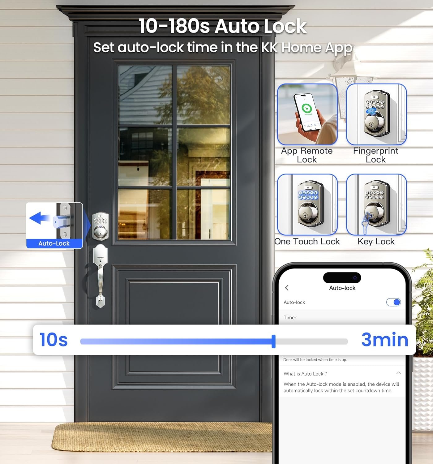 Real-Time Remote Control: Check lock status, get alerts, review access logs, and manage settings via the KK Home App. All data is stored locally on the smart deadbolt for privacy