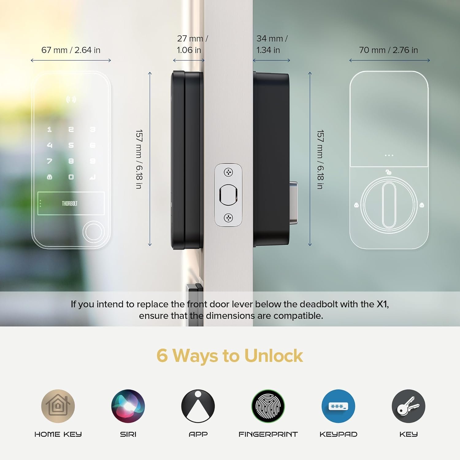 The Smart Lock for the Future (Apple Home over Thread) == Experience the future of smart home tech with Thread support, enabling ultra-reliable and energy-efficient communication between X1 and the Apple Home app. Enjoy instant responsiveness and enhanced connectivity, ensuring your lock operates seamlessly within your Apple ecosystem. With Thread, your smart home is fully controllable directly from the Home app. (Remote access requires a Thread-enabled Apple home hub within 33 feet of X1